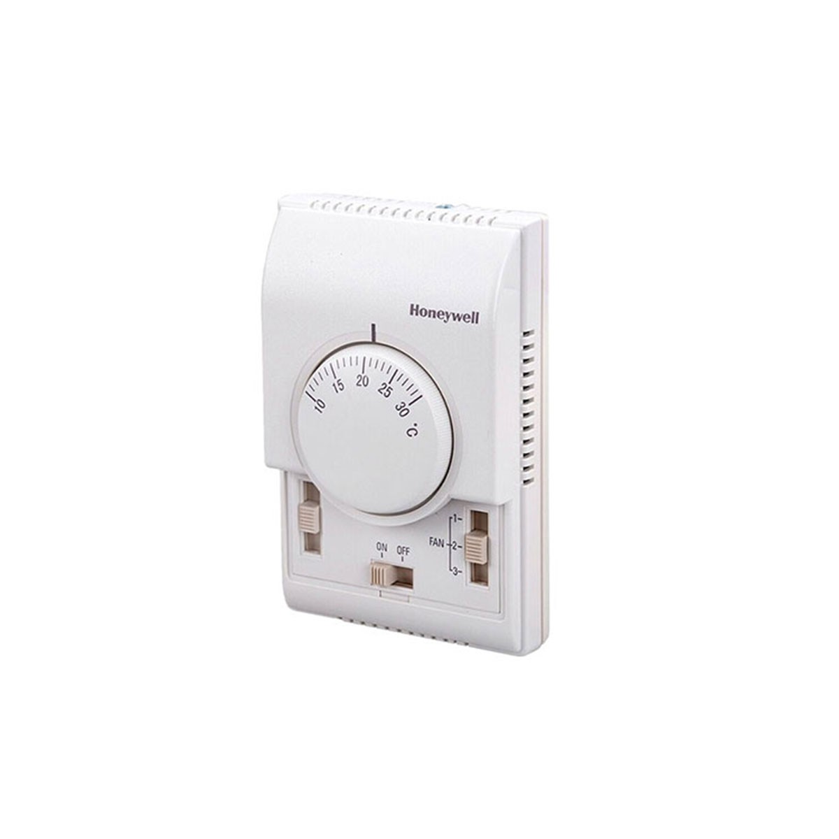 ترموستات هانیول مدل T6373 جهت کنترل دمای محیط، برای فنکویلهای سقفی و زمینی طراحی شده است. به این صورت که حسگر ترموستات دمای محیط را حس میکند و استفاده از سوییچ On/Off تعبیه شده روی ترموستات کنترل فن را امکان پذیر میکند. در این محصول حالتهای موجود به شکل سوییچ سه حالته سرعت به همراه سوییچ قطع و وصل فن طراحی شده است. این ترموستات را در محدودهای از اتاق که دارای دمای متوسط بوده و به خوبی در معرض جریان هوای اتاق قرار دارد، در ارتفاع تقریبا 1/5 متری بالاتر از کف اتاق نصب کنید. دقت کنید که به منظور جلوگیری از بروز خطا در حسگر دما توسط ترموستات، آنرا در نزدیکی وسایل گرم یا سرد و یا در معرض تابش مستقیم نور خورشید نصب نکنید.